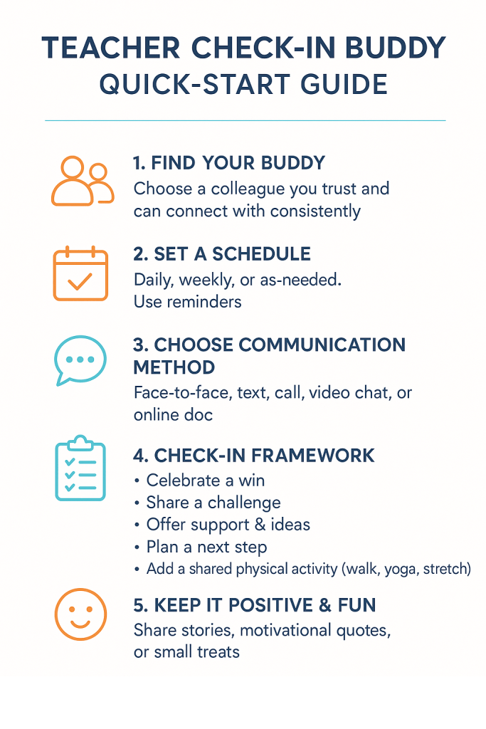 Teachers notoriously put themselves last, but having a check-in buddy can help you remember to take care of yourself. Hydrate, stretch, breathe… and maybe text your buddy a silly selfie while you’re at it 📸💦. Little nudges go a long way—like a virtual high-five every time you check a goal off your list ✋. Anecdotally, buddy pairs who schedule shared self-care moments are happier, less burned out, and sometimes even giggle more at staff meetings.
